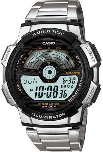 El AE-1100WD-1A combina la estética técnica de un radar con la elegancia de un brazalete metálico. Perfecto para el uso diario con resistencia de 100 m y batería de 10 años.