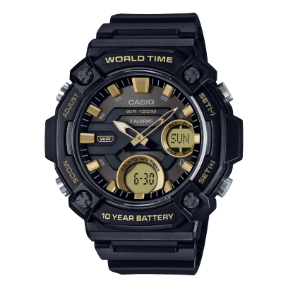 Nombre del producto Casio AEQ-120W-9AV – Ana-Digi Negro con Detalles Dorados y Estilo Elegante