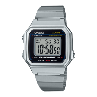 El Casio B-650WD-1A reinterpreta el encanto vintage con una caja más grande y una presencia más marcada. Su estética mezcla lo retro con lo actual: acero ligero, un diseño cuadrado definido y detalles de color que evocan los 80. Robusto, cómodo y altamente funcional, es el compañero ideal para quienes buscan un digital clásico con una presencia más sólida en la muñeca.