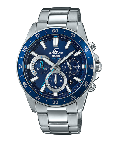 El Casio Edifice EFV-570D-2AV presenta una esfera azul metálica con cronógrafo y bisel deportivo. Es un modelo moderno, versátil y elegante, ideal para uso diario con estilo ejecutivo.