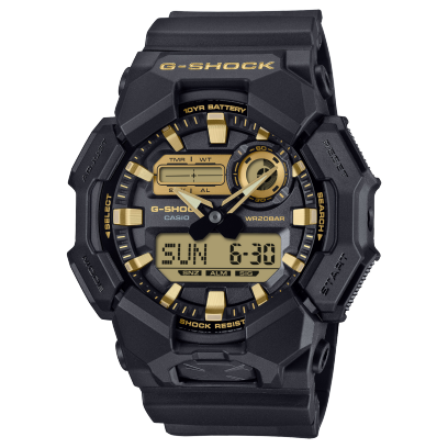 El Casio G-Shock GA-010GB-1A9 combina diseño negro mate con detalles dorados metálicos. Resistente, ligero y llamativo, es un modelo urbano ideal para quienes buscan estilo fuerte y durabilidad extrema.