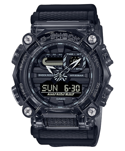 El GA-900SKE-8A es una pieza diseñada como si fuese un instrumento de trabajo pesado dentro del universo G-Shock: transparente, robusto, mecánico sin pedir permiso. La caja smoke deja ver la arquitectura interna, mientras la tornillería expuesta y la correa texturizada intensifican su estética industrial. Un reloj que combina utilidad, presencia y un magnetismo urbano inconfundible.