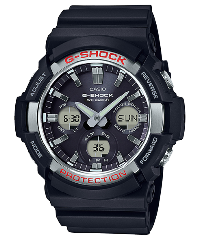 Color Negro mate con anillo metálico plateado y acentos en rojo (G-SHOCK / PROTECTION)