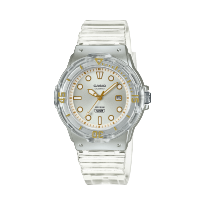 El Casio LRW-200HS-7EV es ligereza visual y funcionalidad real. Su caja y correa transparentes crean un efecto limpio y contemporáneo, mientras los detalles dorados en la esfera aportan un contraste elegante. Un reloj pensado para mujeres activas que buscan un look fresco, actual y fácil de combinar, sin renunciar a la confiabilidad clásica de Casio.