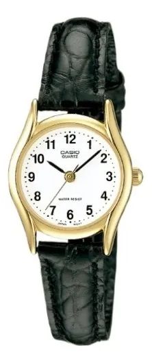 El Casio LTP-1094Q-7B1 es un reloj pequeño, elegante y tradicional que destaca por su caja dorada y su esfera blanca con números grandes y legibles. Su correa negra texturizada le aporta un aire clásico perfecto para mujeres que prefieren relojes discretos, ligeros y con estética tradicional.