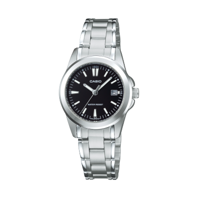 El Casio LTP-1215A-1A2 es un reloj femenino que combina la fuerza visual del negro con la limpieza del plateado.