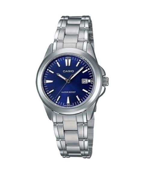 El Casio LTP-1215A-2A2 combina la elegancia del acero con una vibrante esfera azul, creando una pieza moderna y distinguida. Sus marcadores plateados y la función de fecha aportan funcionalidad y claridad, ideal para mujeres que buscan un reloj versátil, resistente y con personalidad luminosa.