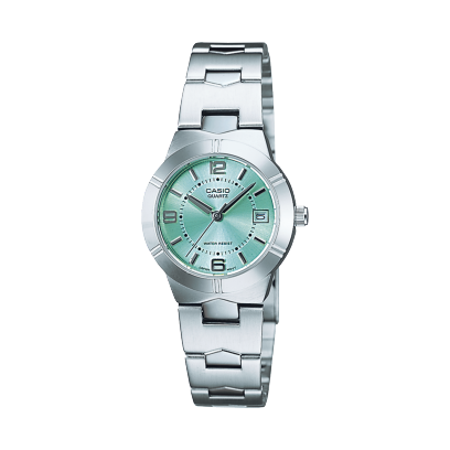 El Casio LTP-1241D-3A es la versión más fresca y ligera de la familia. Su esfera verde menta, suave y luminosa, entrega una personalidad juvenil sin perder el porte ejecutivo.
