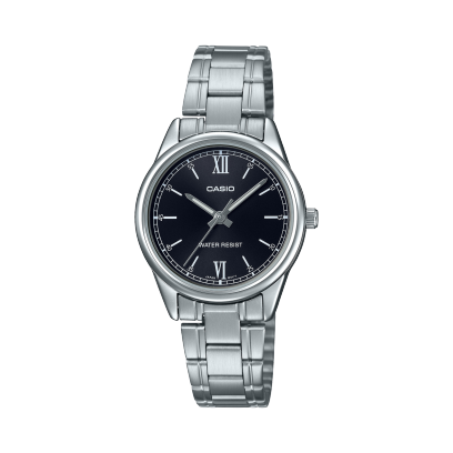 El Casio LTP-V005D-1B2 es una expresión de elegancia sobria. Su esfera negra con numerales romanos y acabado metálico refleja distinción y carácter, ideal para mujeres que buscan un reloj refinado que combine precisión, estilo y una estética contemporánea.
