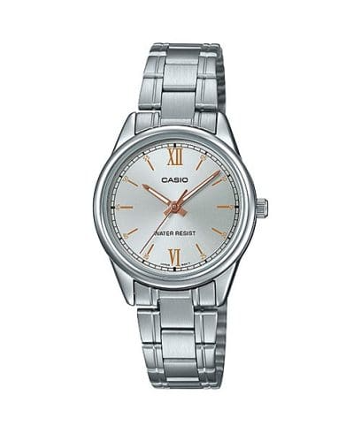 El Casio LTP-V005D-7B2 combina el brillo del acero con detalles dorados que aportan calidez y sofisticación. Su esfera plateada con números romanos equilibra modernidad y tradición, convirtiéndolo en una pieza versátil que realza atuendos ejecutivos o de ocasión.
