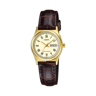 El Casio LTP-V006GL-9B fusiona el brillo del dorado con la calidez del cuero marrón, evocando el encanto de la relojería tradicional. Su esfera champagne con numerales romanos y calendario doble aporta una elegancia atemporal, perfecta para mujeres que valoran la distinción y la funcionalidad diaria.