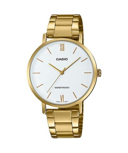 El Casio LTP-VT01G-7B brilla por su sobriedad y elegancia moderna. Su esfera blanca contrasta sutilmente con el dorado del brazalete, creando un reloj versátil que combina con looks ejecutivos, formales o casuales con un toque de distinción.
