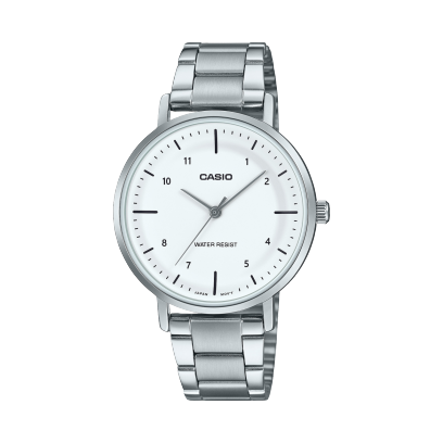 El Casio LTP-VT03D-7B es la expresión más pura del minimalismo: esfera blanca impecable, índices negros y una estructura de acero que proyecta elegancia moderna. Es un reloj ligero, versátil y atemporal, ideal para mujeres que buscan un estilo limpio y profesional.
