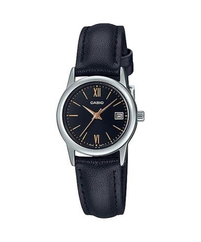 El Casio LTP-V002L-1B3 combina la elegancia del negro con el encanto del dorado rosado. Su diseño refinado con numeración romana y correa de cuero transmite sofisticación atemporal, ideal para mujeres que buscan un accesorio versátil y distinguido para su día a día.