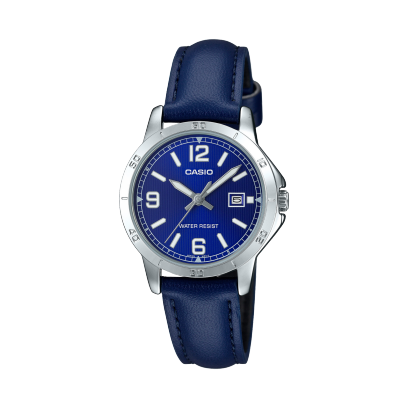 El Casio LTP-V004L-2B irradia frescura y sofisticación con su esfera azul metálica y correa a tono. Su diseño limpio y moderno, combinado con la precisión de Casio, lo convierte en un accesorio ideal para mujeres que buscan un reloj elegante, liviano y versátil para el uso diario.