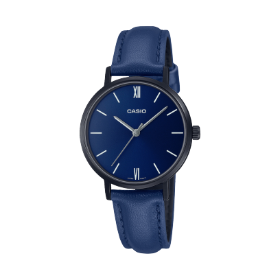 El LTP-VT02BL-2A se distingue por su esfera azul metálica clara y correa de cuero azul marino, una combinación que transmite serenidad y elegancia. Ideal para el día a día o para complementar un look casual chic con sutileza moderna.