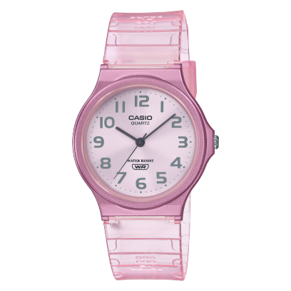 El Casio MQ-24S-4B es una pieza que celebra la suavidad y la transparencia. Su acabado en resina rosa translúcida permite una interacción única con la luz, mientras que su esfera en rosa pastel mantiene una legibilidad clara con numerales en gris oscuro. Es el accesorio perfecto para quienes buscan añadir un toque de color sutil y moderno a su estilo diario sin sacrificar la comodidad extrema que define a la serie MQ.