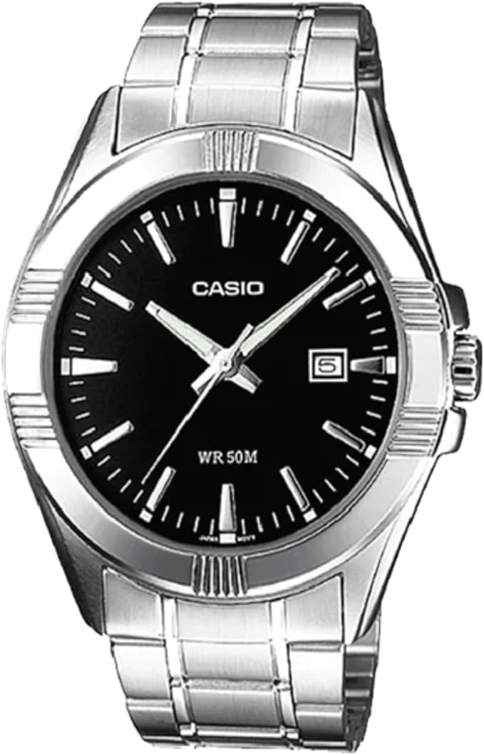 El Casio MTP-1308D-1A es un clásico moderno: esfera negra limpia, bisel con detalles estriados y brazalete de acero que proyecta sobriedad ejecutiva. Su estética equilibrada entre lo deportivo y lo formal lo convierte en un reloj ideal para uso diario, oficina o eventos casuales con estilo.