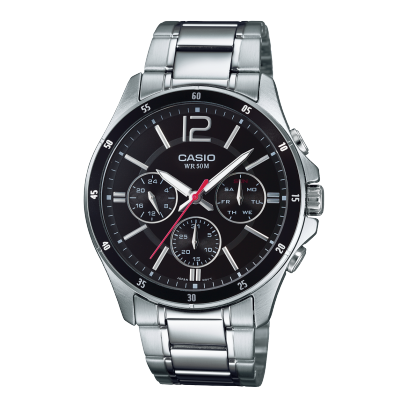 El Casio MTP-1374D-1AV combina una estética de cronógrafo deportivo con la sobriedad del acero pulido. La esfera negra con segundero rojo añade dinamismo visual sin perder formalidad, convirtiéndolo en una pieza ideal para el profesional que quiere proyectar seguridad, ritmo y carácter.