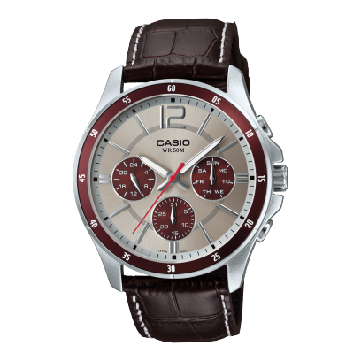 El Casio MTP-1374L-7A1V destaca por su combinación poco común pero muy bien ejecutada: esfera clara con detalles en borgoña y una correa de cuero marrón que aporta calidez y sofisticación. Las subesferas multifunción mantienen el equilibrio entre información y estética, convirtiéndolo en un reloj ideal para quienes quieren verse formales sin caer en lo predecible.