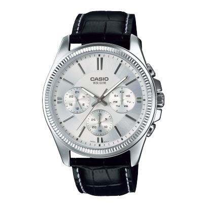 El Casio MTP-1375L-7AV apuesta por una estética clara y equilibrada. Su esfera plateada maximiza la legibilidad y transmite orden visual, mientras que las subesferas multifunción se integran con discreción y simetría. La correa de cuero negro refuerza su carácter formal, convirtiéndolo en una pieza ideal para contextos profesionales donde la elegancia es silenciosa pero firme.