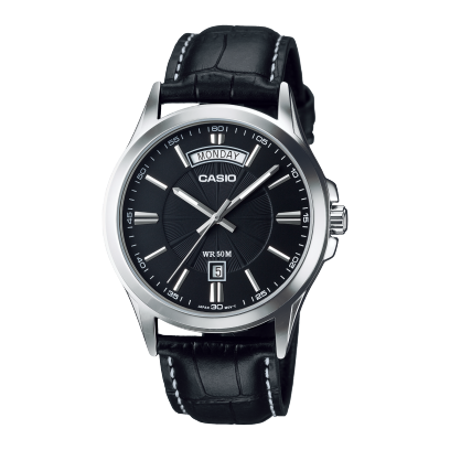 El Casio MTP-1381L-1A es la definición de sobriedad profesional. Esfera negra profunda, doble calendario bien integrado y correa de cuero que grita “reunión importante a las 9”. Un reloj confiable, elegante y listo para el día a día corporativo.