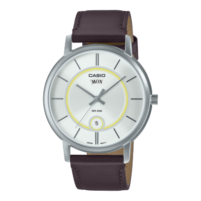 El Casio MTP-B120L-7A juega con la simplicidad y el detalle justo. Su esfera blanca, intervenida por un sutil anillo amarillo, aporta identidad sin ruido. El indicador de día y fecha está integrado con elegancia, mientras la correa de cuero marrón suma calidez y versatilidad. Un reloj pensado para quienes valoran el diseño limpio con personalidad.