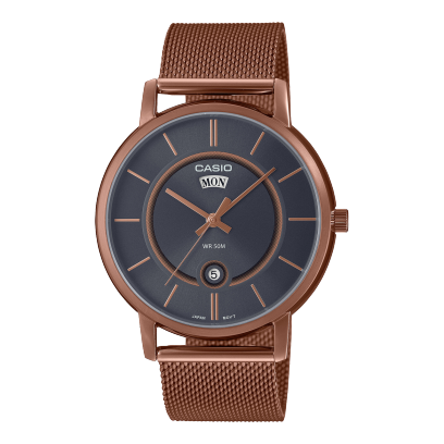 El Casio MTP-B120MR-8A combina una esfera gris antracita sobria con un acabado rosé que aporta calidez y sofisticación. Su malla milanesa realza el carácter urbano y moderno del diseño, mientras la función day-date lo convierte en un reloj práctico y elegante para el día a día con estilo.