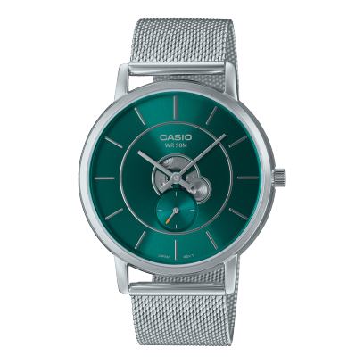 El Casio MTP-B130M-3A ofrece una estética moderna y refinada gracias a su malla milanesa y su vibrante esfera verde esmeralda. El subdial de segundos aporta un detalle técnico minimalista, mientras que el diseño delgado lo convierte en una pieza ideal para looks elegantes, urbanos y contemporáneos.