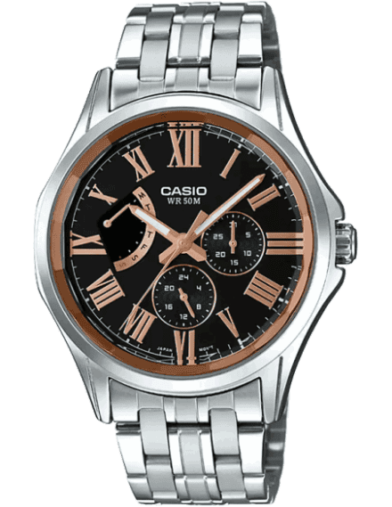 El Casio MTP-E311DY-1AV fusiona la tradición de los numerales romanos con un contraste moderno en tonos cobre sobre negro profundo. El resultado es una pieza con presencia, equilibrio y lectura clara, reforzada por subesferas multifunción que aportan utilidad real para la rutina diaria. Un reloj pensado para quienes quieren elegancia clásica sin caer en lo predecible.