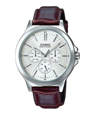 El Casio MTP-V300L-7A combina elegancia clásica con funcionalidad práctica gracias a sus subesferas multifunción. Su esfera blanca limpia, acompañada de una correa de cuero marrón, lo convierte en un reloj ideal para oficina, reuniones o eventos formales, ofreciendo un look refinado con información completa al primer vistazo.