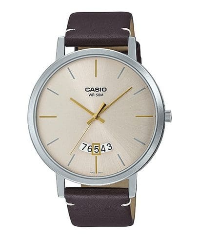 El MTP-B100L-9E combina una esfera dorada champagne con una correa de cuero marrón claro, logrando una presencia cálida y refinada. Un reloj sobrio y elegante, ideal para oficina, eventos y atuendos formales o casuales con distinción.
