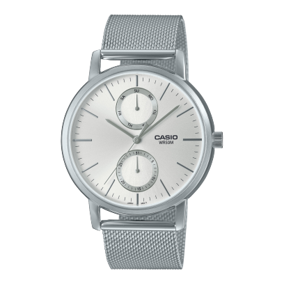 El MTP-B310M-7A combina la sofisticación de una malla milanesa plateada con la sobriedad de una esfera blanca multifunción. Un reloj versátil y elegante, ideal para oficina, eventos y uso diario refinado.