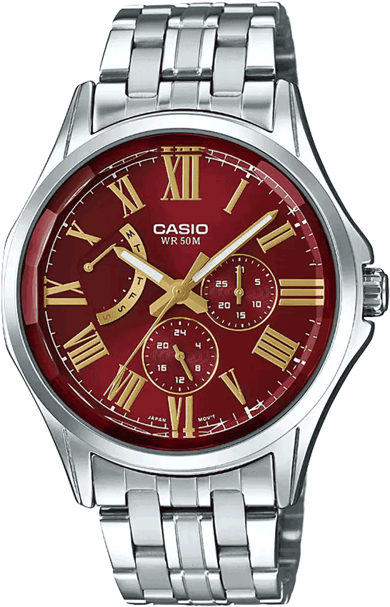 El Casio MTP-E311DY-4AV apuesta por una estética clásica con un giro audaz. La esfera rojo burdeos, combinada con numerales romanos dorados, crea una presencia elegante y poco común que destaca sin caer en la exageración. Las subesferas multifunción aportan utilidad real para la jornada, mientras el brazalete de acero mantiene el conjunto firme y profesional.