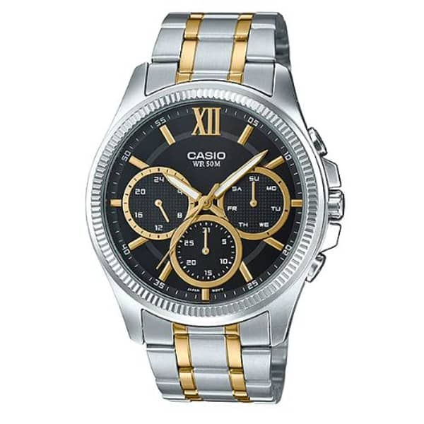 El Casio MTP-E315SG-1AV combina el refinamiento del acero bicolor con una esfera negra multifunción. Los detalles dorados en índices y agujas aportan un aire sofisticado y elegante, ideal para oficina, reuniones y eventos formales.