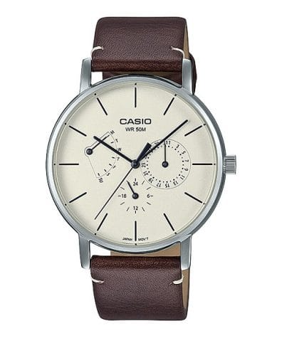 El Casio MTP-E320L-5E es un reloj minimalista con esfera blanca y correa de cuero marrón, que aporta un aire cálido y sofisticado. Su diseño sobrio y elegante lo hace perfecto para ocasiones formales o un look casual refinado.