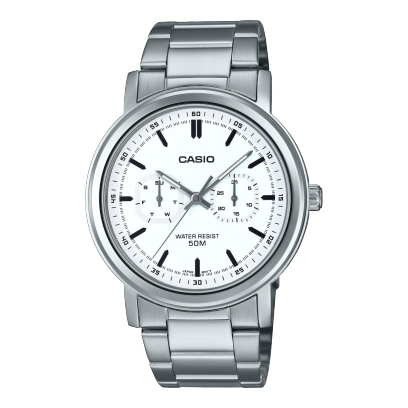El Casio MTPE335D-7EV combina una esfera blanca multifunción con detalles en negro que aportan dinamismo. Su brazalete metálico y diseño sobrio lo hacen perfecto para quienes buscan un reloj formal pero práctico para el día a día.