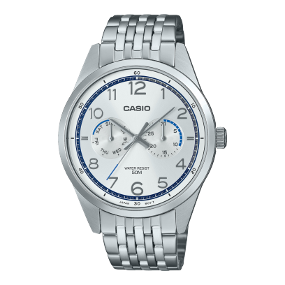 El Casio MTPE340D-7AV presenta un diseño clásico y refinado con esfera blanca multifunción y brazalete metálico plateado. Una pieza elegante y práctica, ideal para oficina, eventos y uso diario con un aire sofisticado.