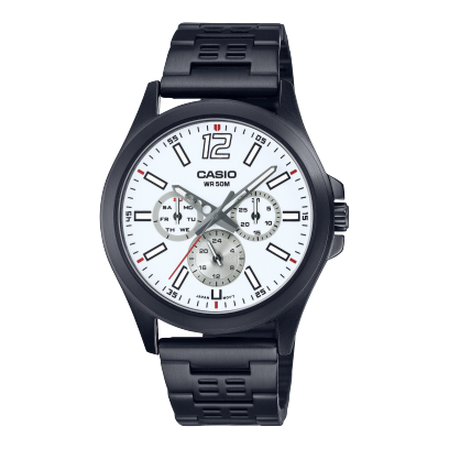 El Casio MTPE350B-7B combina un elegante acabado negro IP con una esfera blanca multifunción que aporta contraste y claridad. Sus detalles en rojo y subesferas lo dotan de un carácter dinámico y moderno, perfecto para oficina, eventos o un look urbano refinado.