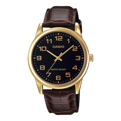 El Casio MTP-V001GL-1B destaca por su caja dorada y esfera negra con numerales dorados, logrando un look elegante y sofisticado. La correa de cuero marrón completa un diseño atemporal, perfecto para eventos formales o como pieza distintiva de oficina.