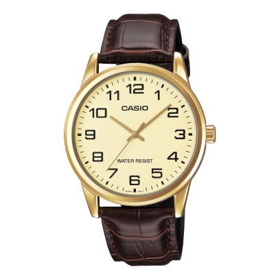 El Casio MTP-V001GL-9B es un reloj de corte clásico que destaca por su acabado dorado en caja y la correa de cuero marrón, ofreciendo un look cálido y refinado. Su diseño minimalista, con esfera clara e índices nítidos, lo convierte en un accesorio perfecto para atuendos formales o semi-formales.