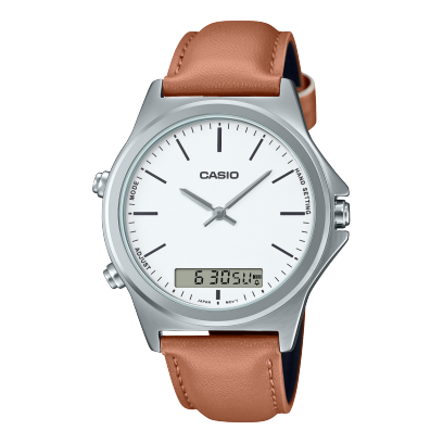 El Casio MTP-VC01L-7E combina la estética minimalista de una esfera blanca con la practicidad de un display digital inferior, ofreciendo lo mejor de ambos mundos. Su correa de cuero marrón le añade un aire clásico y versátil, ideal para el uso diario con estilo.