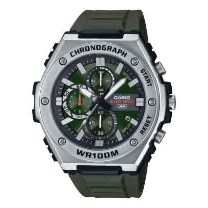 El Casio MWA-300H-3AV ofrece un diseño militar robusto en verde con luz LED frontal y resistencia al agua de 100 m. Un analógico simple, práctico y confiable para el uso diario y actividades outdoor.