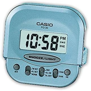 El Casio PQ-30-2D es un despertador digital compacto en azul brillante, con pantalla positiva clara, alarma diaria con función snooze y luz de fondo. Portátil y moderno, ideal para viaje o uso en el hogar.