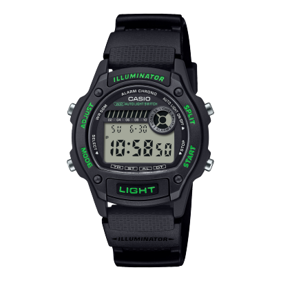 El W-220H-1A3V destaca por sus acentos verde neón que le dan una apariencia deportiva y juvenil sin perder la esencia resistente de la serie W-220. Con WR100M, iluminación potente y diseño ergonómico, es perfecto para deporte, uso urbano y actividades diarias.