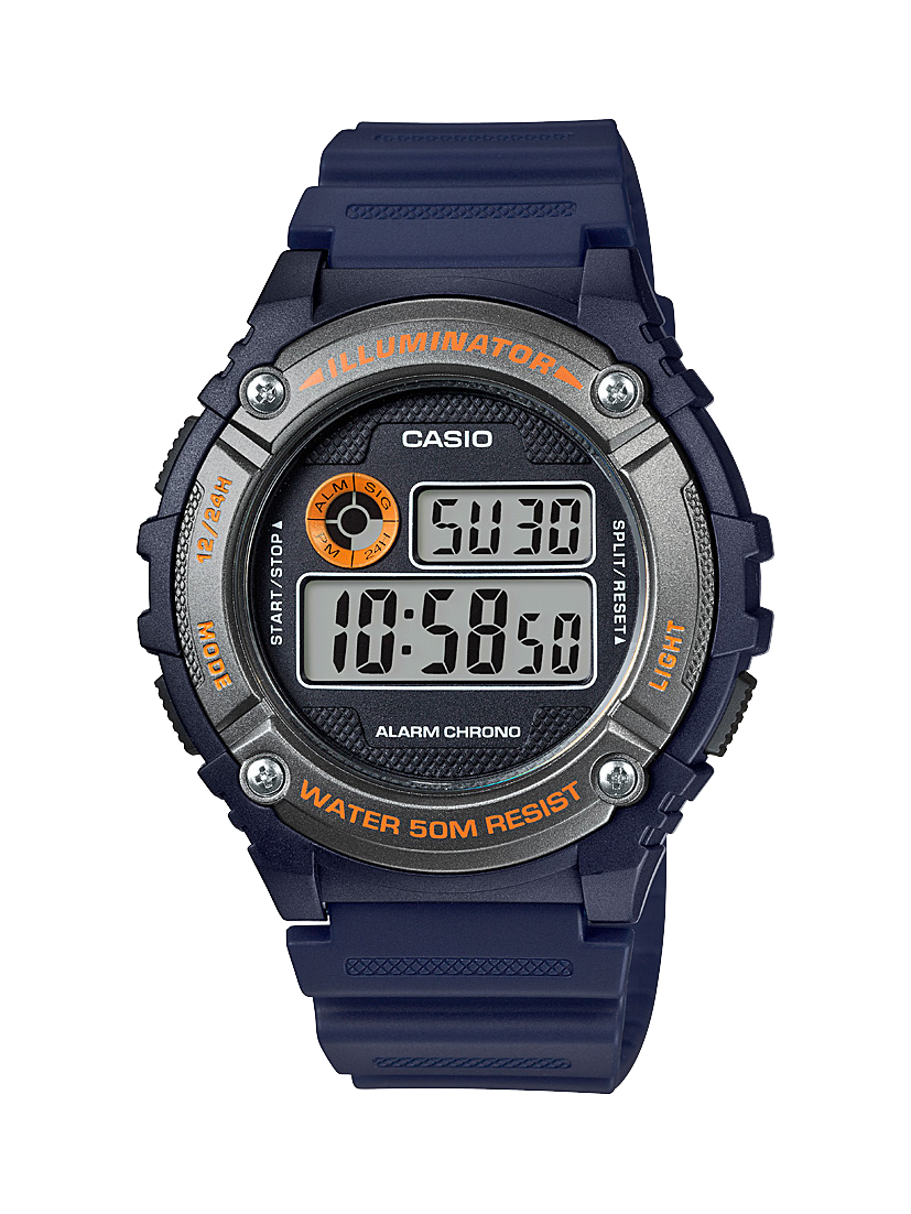 El Casio W216H-2A ofrece un diseño retro deportivo en azul marino con pantalla positiva, resistencia al agua de 50 m y funciones esenciales para el día a día. Ligero, versátil y cómodo de llevar.