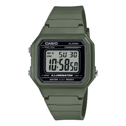 El Casio W217H-3AV es un digital retro con acabado verde militar, pantalla positiva y resistencia al agua de 50 m. Ligero, duradero y perfecto para un look casual o outdoor.