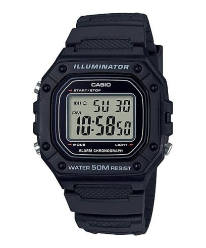 El Casio W218H-1A es un digital robusto y ligero en negro, con pantalla positiva y resistencia al agua de 50 m. Ideal para uso diario y actividades deportivas ligeras.