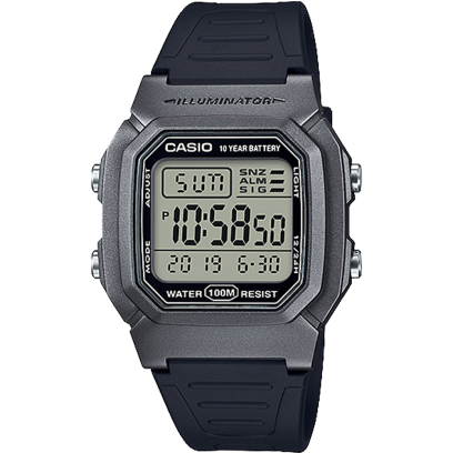 El Casio W-800HM-7A es una variante en gris plateado del clásico digital W-800H. Ofrece resistencia al agua de 100 m, batería de 10 años y funciones básicas confiables en un diseño versátil y urbano.