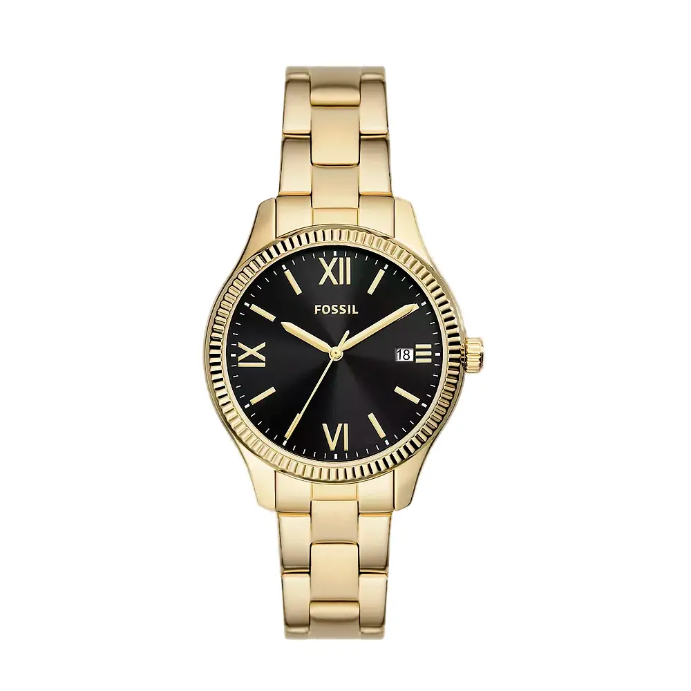 El Fossil BQ2829M combina el refinamiento del dorado con la profundidad de una esfera negra, logrando una estética elegante y poderosa. Su diseño con numerales romanos y bisel acanalado lo convierte en una pieza atemporal, ideal para acompañar estilos ejecutivos o de noche.